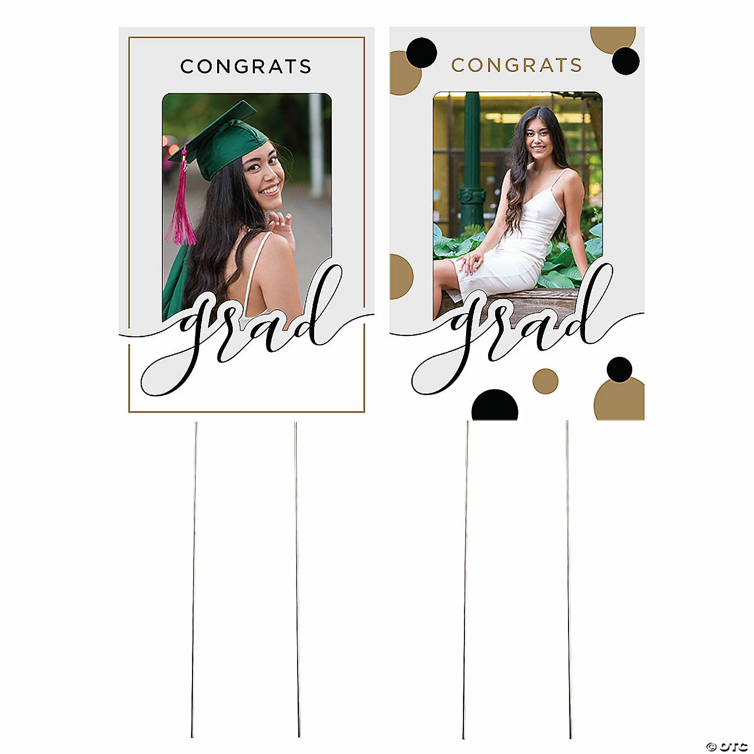 Celebrate the accomplishments of your graduate with these eye-catching yard stakes. Each yard stake has a βcongrats gradβ message and an open spot for a 5β x 7β photo. Fill the signs with photos of the graduate throughout the years or use candid photos. Great as yard decorations for an outdoor graduation party, these yard stakes will help the grad feel celebrated! Corrugated plastic. 7 1/2″ x 11 1/2″ with 5″ x 7″ photo opening. Simple assembly required. © OTC