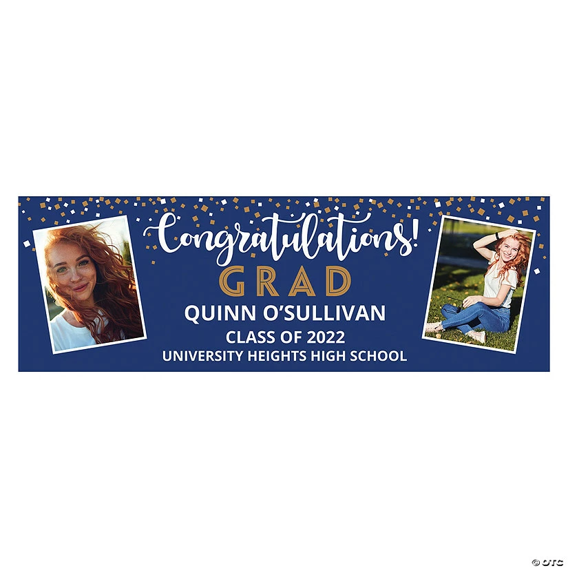 Celebrate the grad with this impressive custom banner, complete with uploaded images and personalized text. The graduate will certainly feel recognized and celebrated with this eye-catching banner displayed! A great choice for a graduation party wall decoration or as a graduation announcement to the entire neighborhood, this banner will get noticed! Vinyl. Includes adhesive tabs for hanging. Personalize with 3 lines of text and 2 uploaded photos. © OTCSizes:β’ Small: 52″ x 17″β’ Medium: 72″ x 23″β’ Large: 90″ x 29″