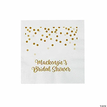 Add to the celebratory feel of your event with these fun paper napkins. Featuring a cute confetti pattern and personalized text, these disposable napkins are great for bridal showers, wedding receptions, fundraisers or anniversary dinners. Impress guests with these unique napkins and help make clean-up easier! Paper. (50 pcs. per unit) 5″ Personalize with 2 lines of text. Β© OTC