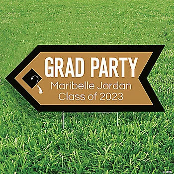 Let everyone know where the graduation party is taking place with this eye-catching yard sign! Shaped like an arrow, this personalized sign will guide graduation party guests to where the festivities are happening while also announcing thereβs an accomplished graduate to celebrate! Add this sign to your graduation party supplies. Corrugated plastic. 24″ x 10″ Personalize with 2 lines of text.Β Includes metal stakes. Single-sided. Simple assembly required. © OTC