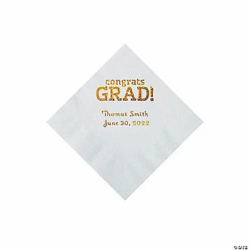 Whether you’re planning a grand grad party or a small grad gathering, these napkins are the perfect choice when shopping for graduation supplies. Ideal for keeping messy fingers clean in style, these napkins display “Congrats Grad!” messaging and are ready to customize with the grad’s name and their grad party date. Personalize with 2 lines of text. Printed with gold or silver foil. Paper. (50 pcs. per unit) Beverage, 5″; luncheon, 6 1/2β. Not microwave safe. Β© OTC